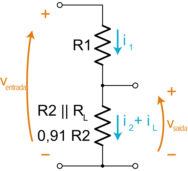 O resistor age como uma carga na saída do divisor de tensão, significando ela acarreta um fluxo de corrente . A presença de significa que e não estão mais estritamente em série. Vamos fazer bem grande, para tornar bem pequena em relação a . Seja dez vezes maior que ,